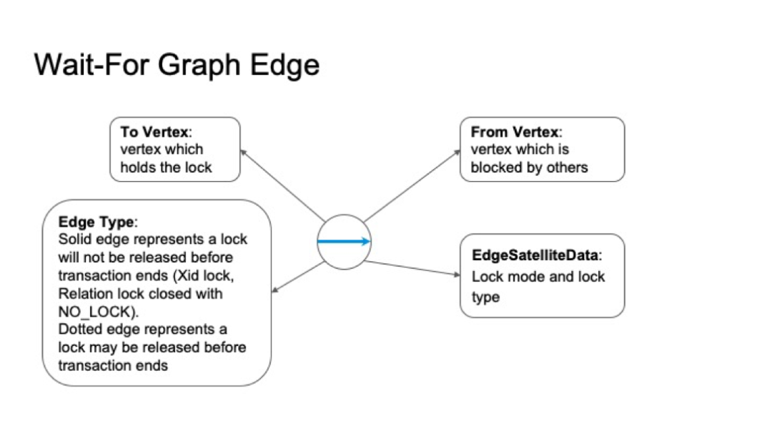 边类型:并非所有锁在事务结束时都被释放,例如,xidlock可以提前释放,而无需等待分布式事务提交。我们将这种提前结束的等待关系使用虚边表示。与之对应的是实边,事务结束使才释放的锁等待关系。稍后,我们将展示全局死锁检测算法中对这两种边的不同处理。