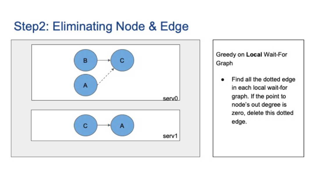 现在,让我们看看如何消除不相关的节点。首先,节点C的出度为零,我们可以删除该节点和相应的边。现在在Server1的本地等待图上,指向B点的虚边没有出度,因此也可以删除该虚边。删除虚边后,节点A的出度变为零,可以删除,最后也可以删除节点B。没有边,因此在这种情况下没有全局死锁。
