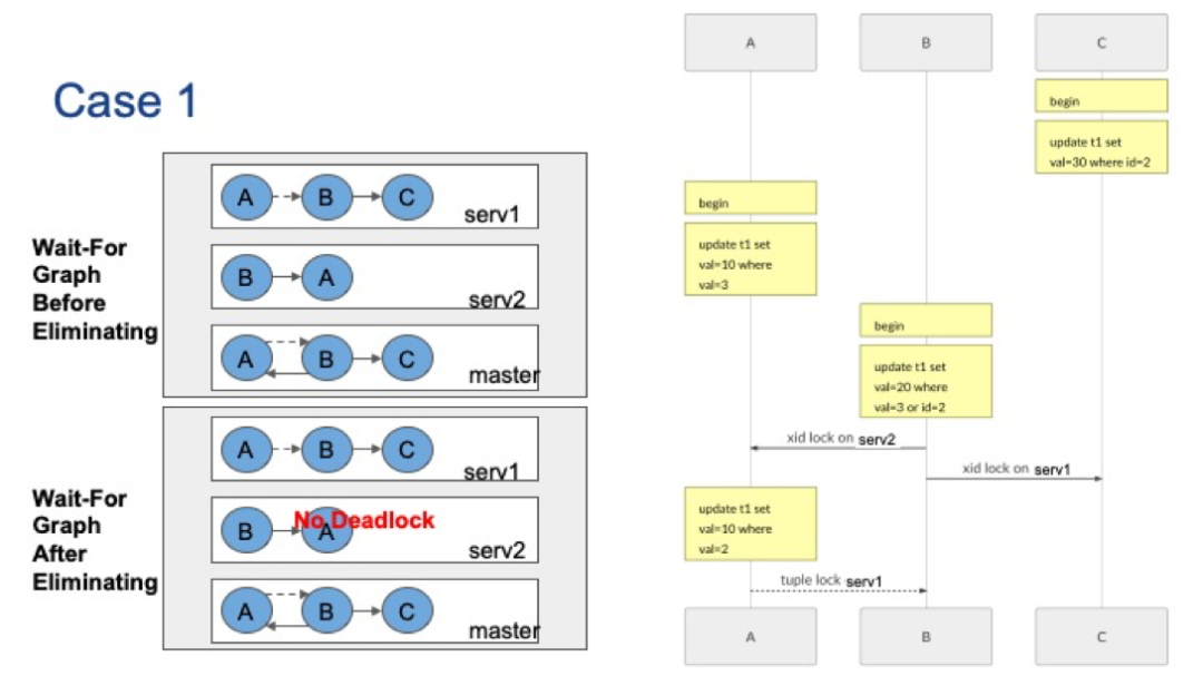 下图的第二个例子中,包括三个并发会话。会话C首先将更新ID=2的元组,这将在server1上持有xid锁。然后,会话A将更新val=3的元组,它将在server2上持有xid锁。会话B要更新val=2的元组,它将被server1上的会话C阻止。