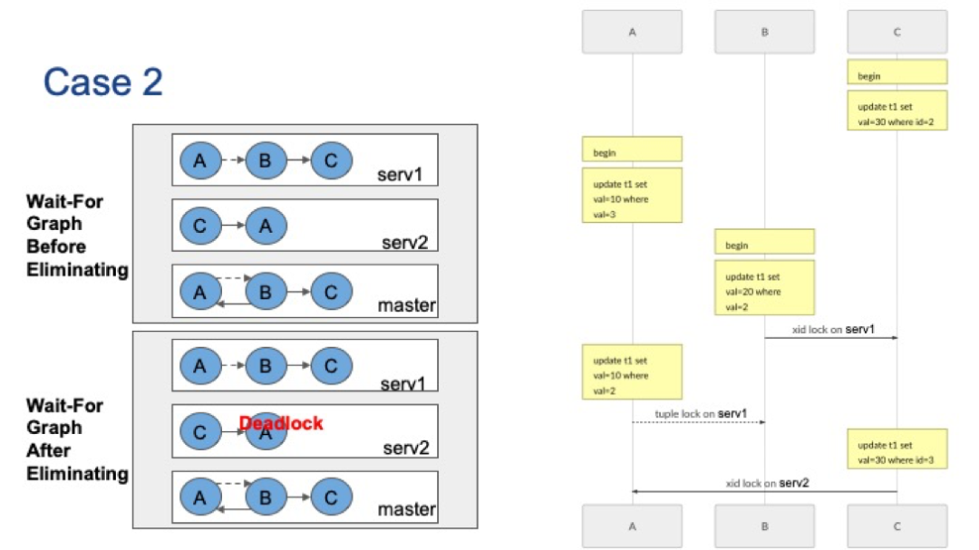 第一种例子中,有三个并发会话。会话C首先更新ID=2的元组,这将使server1上持有xid锁。会话A更新val=3的元组,它将在server2上持有xid锁。接着,会话B要更新val=3或id=2的元组,它将分别被server1和server2上的会话A和会话C阻塞。最后,会话A要更新server1上val=2的元组。