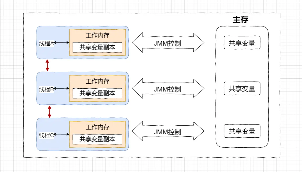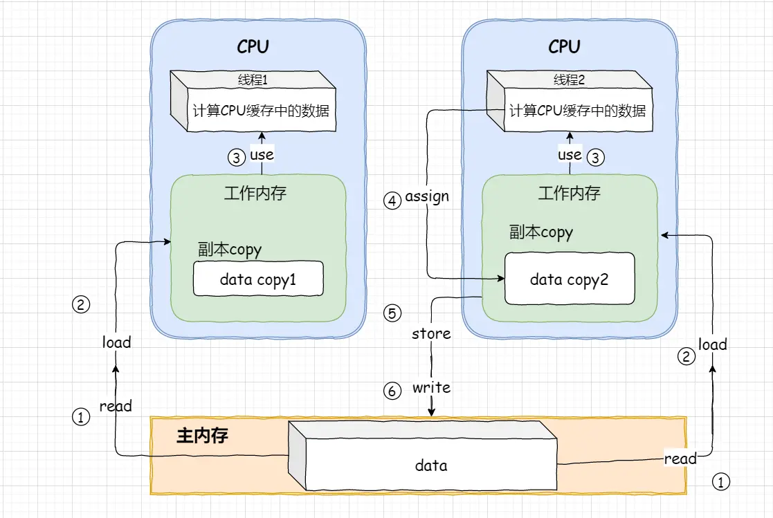 每个线程都有自己独立的工作区间,为了匹配CPU的运行速度,他们不会直接从内存中读取数据,而是将数据拷贝一份到CPU缓存中(即每个线程自己的工作内存),他们之间的相互交互,是通过内存来完成的。