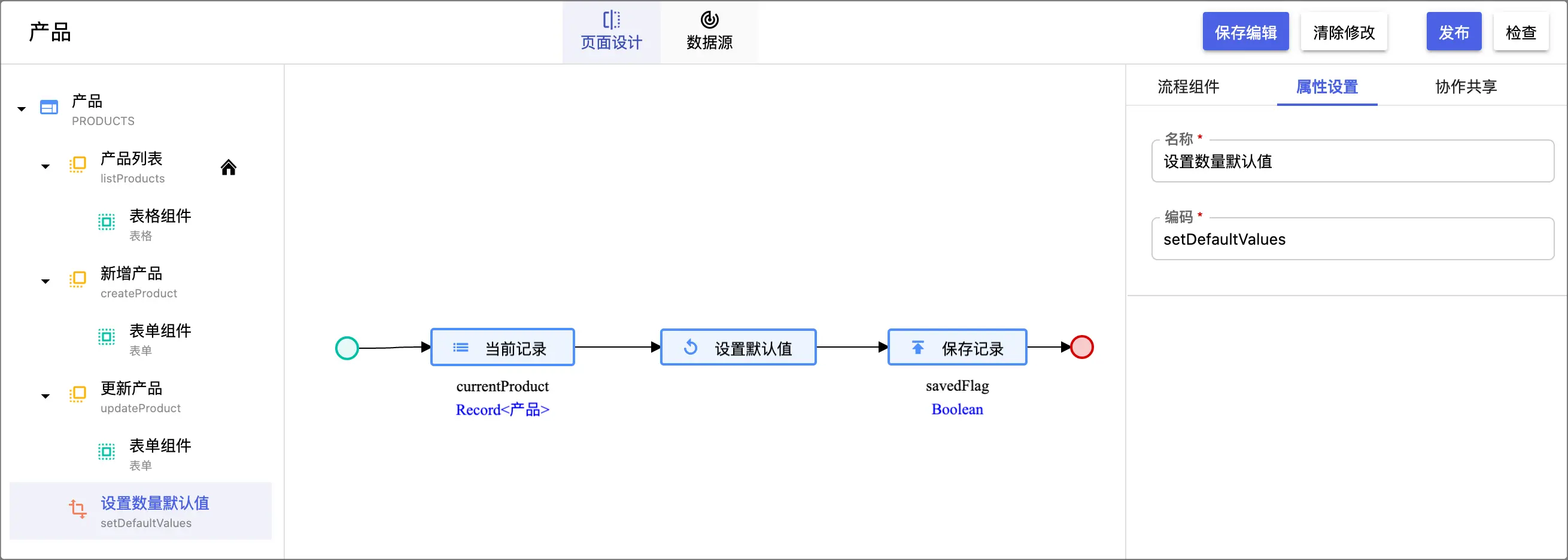 属性的默认值如果是静态值,可以在业务对象属性定义的时候设置,如果需要进行计算或者复杂逻辑的可以通过页面流或者逻辑流来实现,本课程为了展示的目的采用页面流的功能来设置默认值为0。