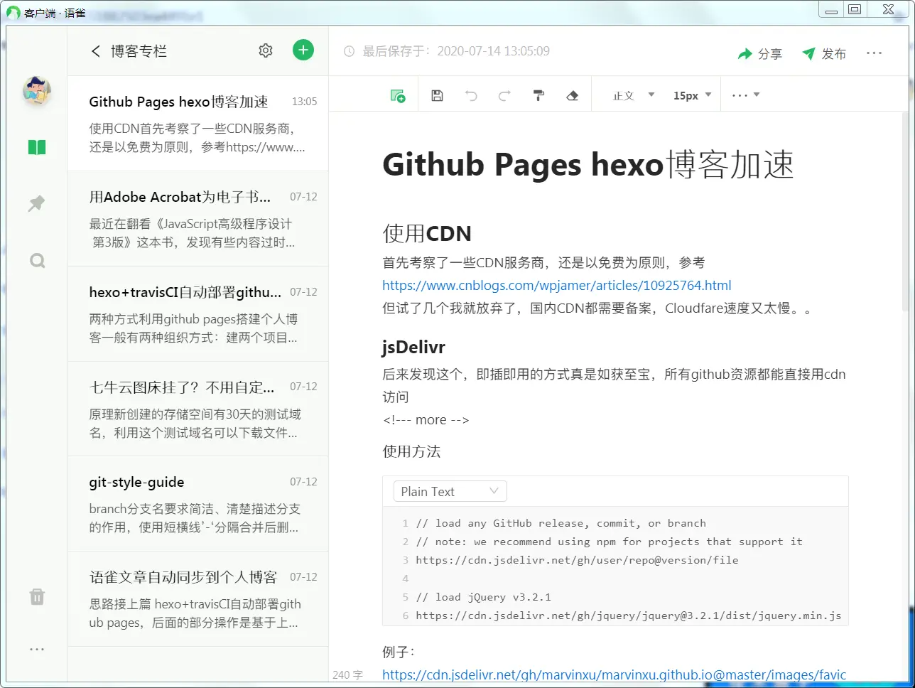 直接在语雀里写文章,写完点“发布”,就同步到个人博客
