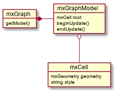 事务功能由 mxGraphModel 类实现,每个 mxGraph 实例对应一个 mxGraphModel 对象,用于管理文档状态 mxCell 属性,可通过 getModel 方法获得。三个类的关系如下图: