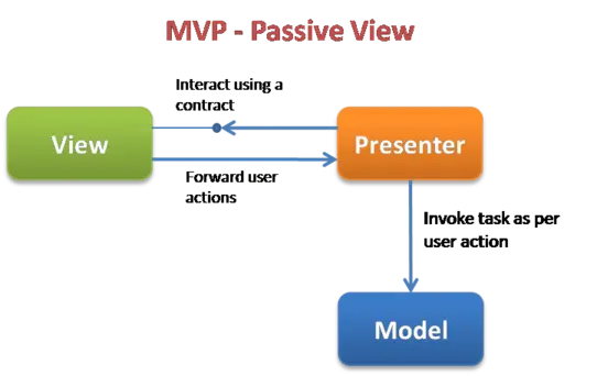 - Passive View: 顾名思义如 passive(被动)所示,在这个模式中 View 是不包含任何逻辑的,它是被动的被调用方。View 和 Model 完全被Presenter 隔开,Presenter 充当中介的角色分别与两者沟通。Presenter 可以监听的 Model 层上的一些事件。当数据发生修改时,事件就会被触发,接着 Presenter 再通过 View 上暴露的方法对 View 进行数据更新。