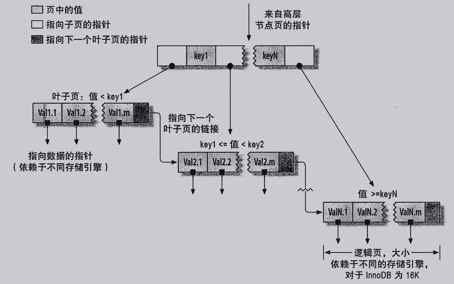 页节点比较特别,它们的指针指向的是被索引的数据,而不是其他的节点页(不同引擎的“指针”类型不同)。