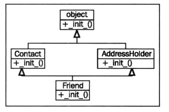 注意:在前面的例子中如果我们将HouseRental继承顺序改为(House, Rental),将不会触发Rental.display()方法。因为当调用House.display方式时,会调用Property.display方法。但是Property.display()中没有调用super,所以调用不了Rental.display方法。如果在Property中调用super().display()方法则不行,因为object对象没有display方法。可行的方式是Rental也继承Property,就成了之前讲到的钻石继承问题了。super()能轻松的解决。