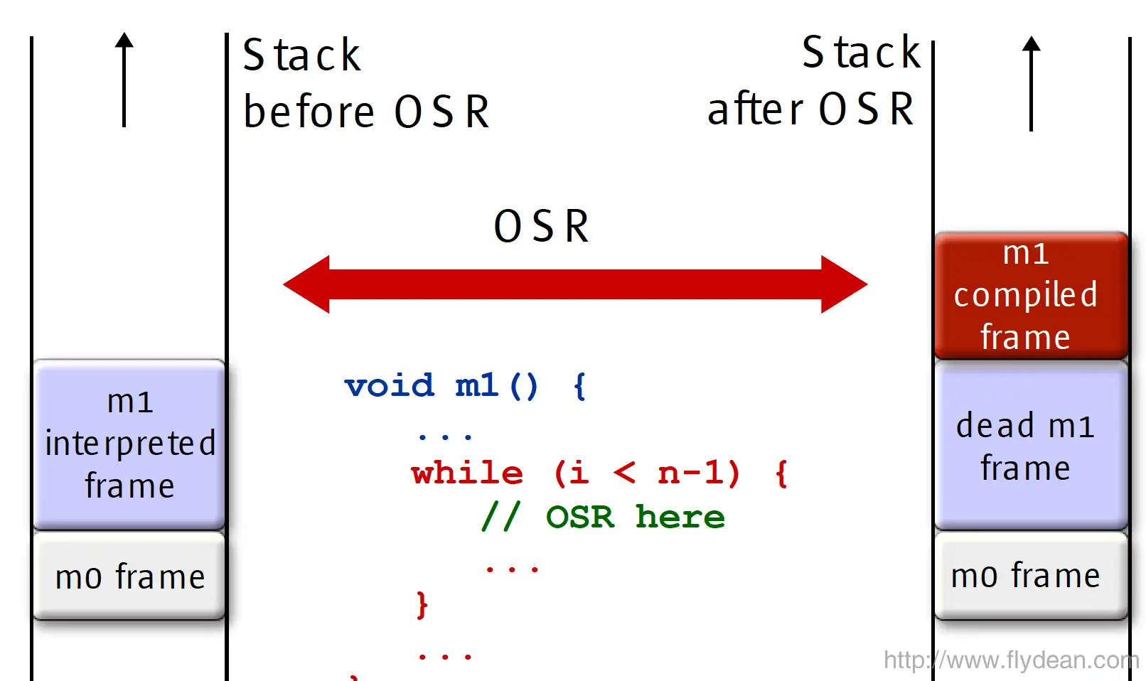 对的,这个过程就叫做OSR(On-Stack Replacement)。为什么叫OSR呢?我们知道JVM的底层实现是一个栈的虚拟机,所以这个替换实际上是一系列的Stack操作。