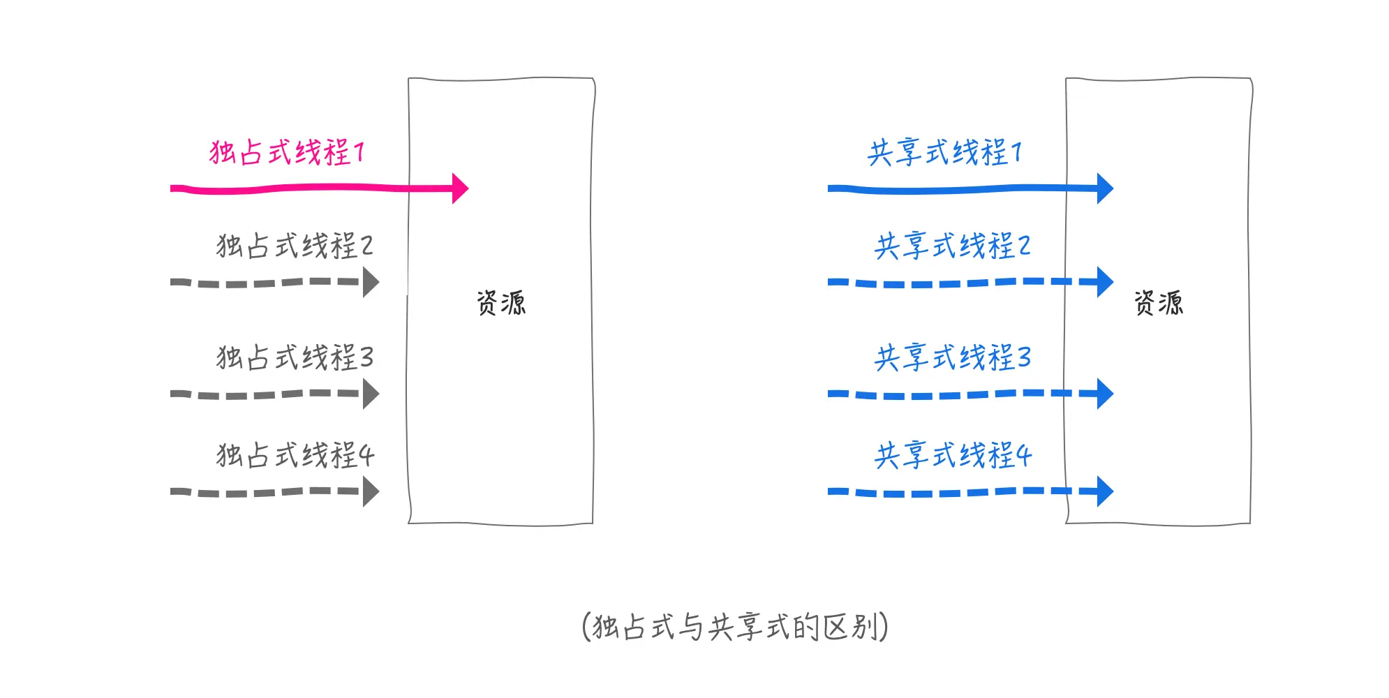 独占式是你中没我,我中没你的的一种互斥形式,共享式显然就不是这样了,所以他们的唯一区别就是: