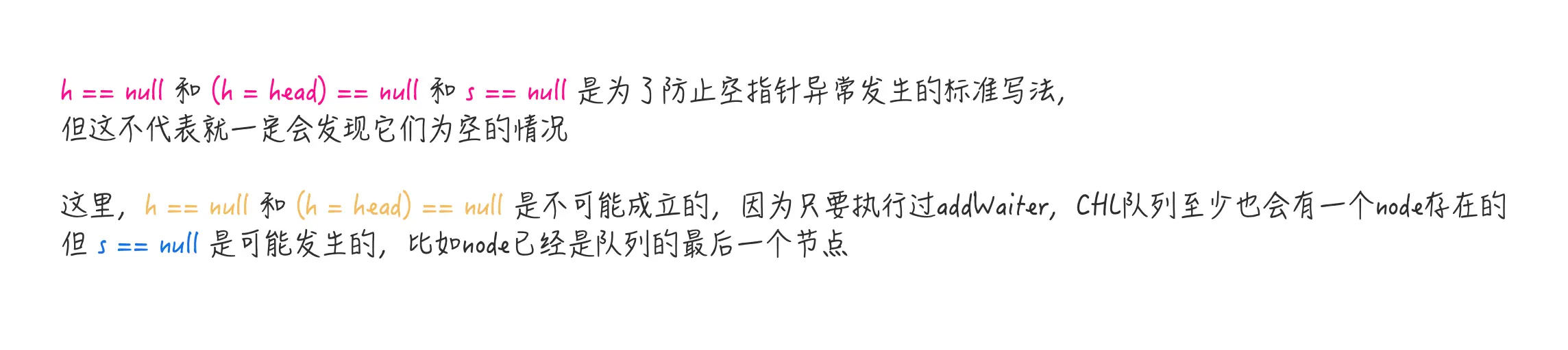 // 这里后继节点为空意思是只剩下当前头节点了,另外这里的 s == null 也是判断空指针的标准写法