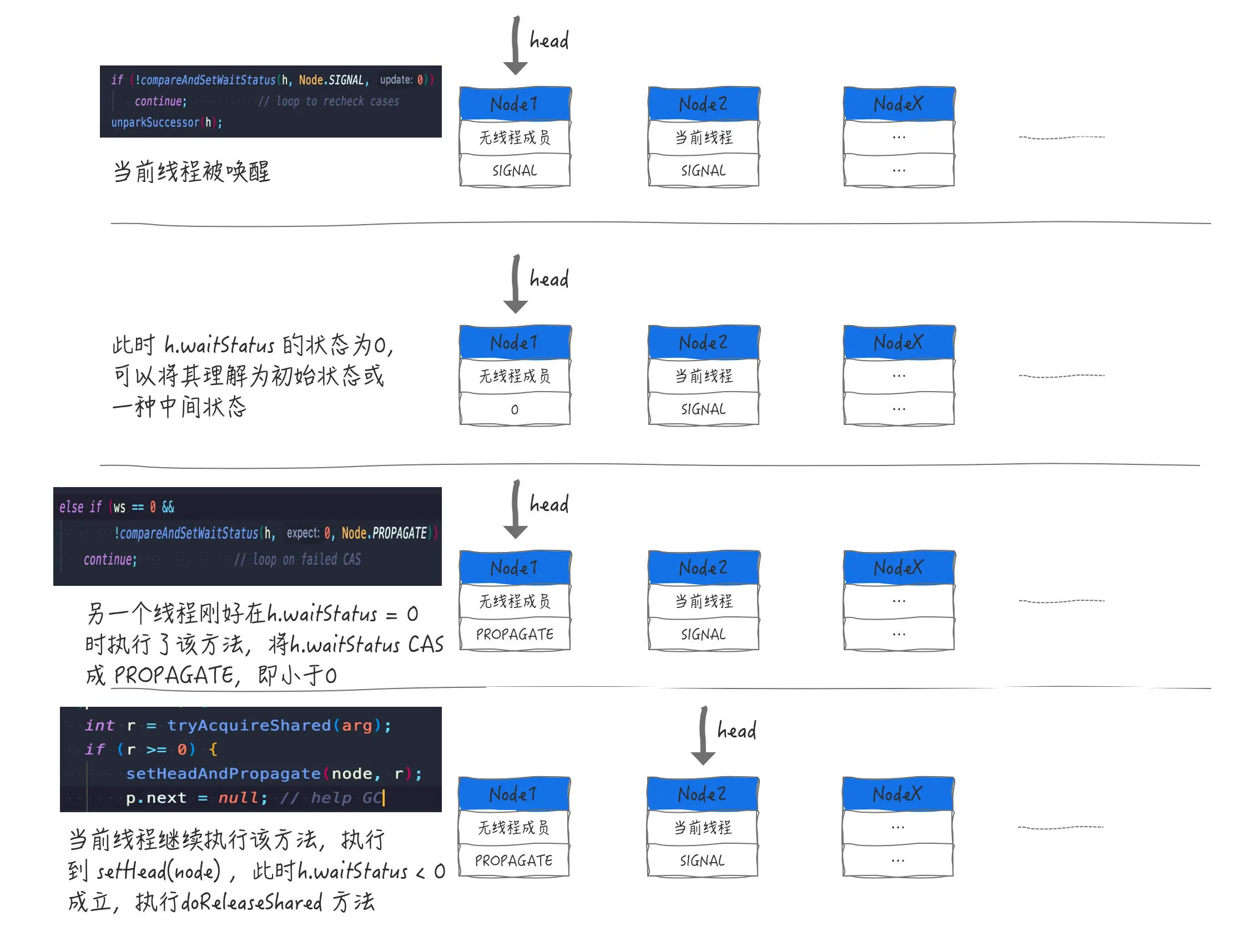 可能有同学还是不太能理解这么写的道理,我们一直说 propagate <> = 0 的情况,propagate = 0 代表的是当时/当时/当时 尝试获取同步状态没成功,但是之后可能又有共享状态被释放了,所以上面的逻辑是以防这种万一,你懂的,严谨的并发就是要防止一切万一,现在结合这个情景再来理解上面的判断你是否豁然开朗了呢?