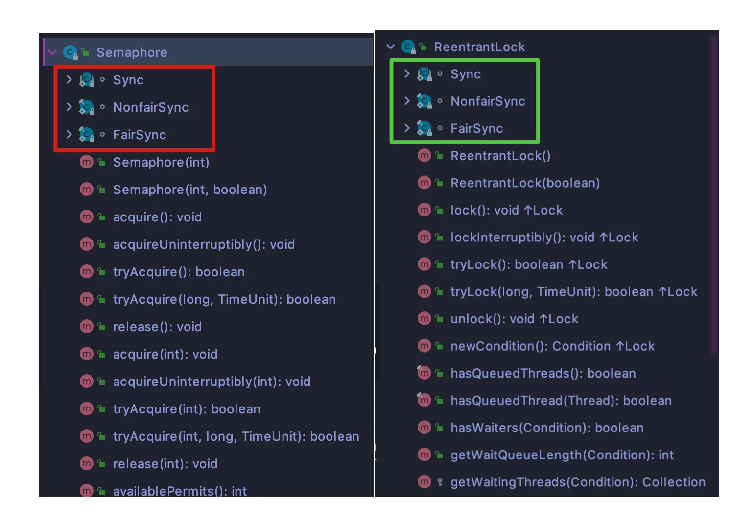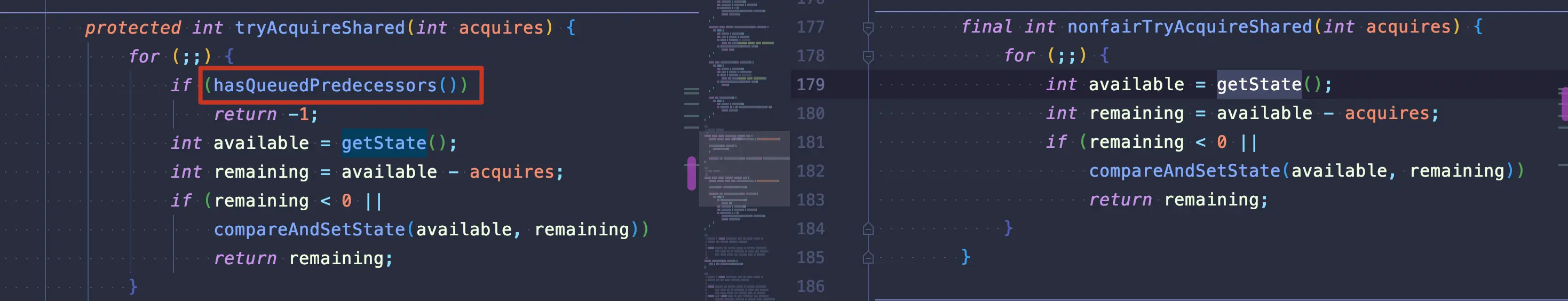 看到这里你是否有点跌眼镜,和 ReentrantLock 相似的可怕吧,如果你有些陌生,再次强烈建议你回看上一篇文章 Java AQS队列同步器以及ReentrantLock的应用 ,这里直接提速对比看公平和非公平两种重写的 tryAcquireShared(arg) 方法,没有意外,公平与否,就是判断是否有前驱节点