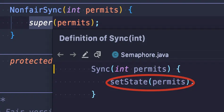 super 方法,就会将初始值给到 AQS 中的 state