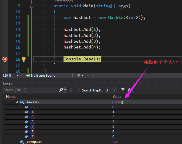 从图中可以看到,最后的扩容是在 ExpandPrime 方法中完成的,流程就是先 * 2, 再取最接近上限的一个质数,也就是 7 ,然后将 7 作为 HashSet 新的Size,如果你非要看演示,我就写一小段代码证明一下吧,如下图: