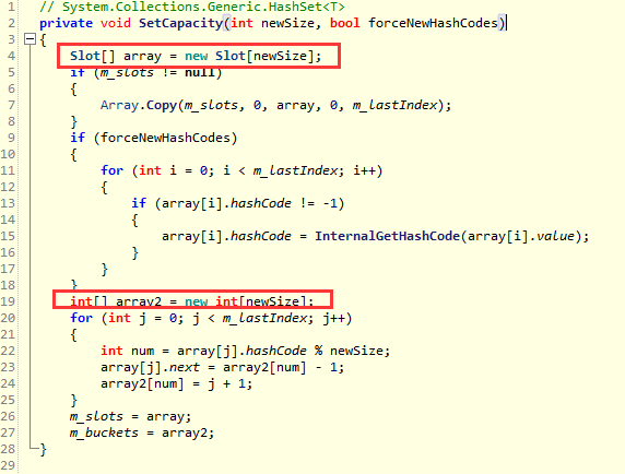 当HashSet的个数达到3之后,很显然要进行二次扩容,这一点不像List用一个 EnsureCapacity 方法搞定就可以了,然后细看一下怎么扩容。