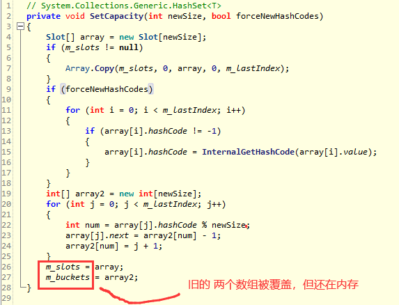 HashSet的时间和空间上虚占远比你想象的大很多,而且实占也不小,因为底层用到了双数组 m_slots 和 m_buckets,每个Slot还有三个元素: struct Slot { int hashCode;internal int next;internal T value; },所以了解完原理之后谨慎着用吧。