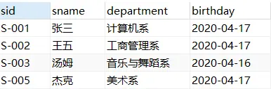 INSERT INTO students VALUES (1003, '杰克', '美术系', '2020-06-16');
