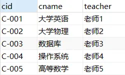 INSERT INTO course VALUES (5, '高等数学', '老师5');