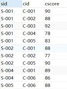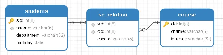 - 选课关系中的 学号(sc_relation.sid) 和 课程号(sc_relation.cid) ,分别代表选课关系的外键,他们分别对应 学生关系的学号(students.sid) 和 课程关系的课程号(course.sid)(不一定要同名,但是为了好理解,一般写成同名)
