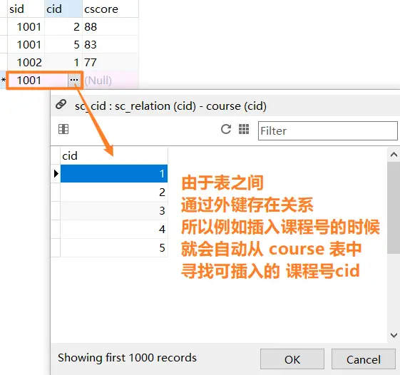 有什么用呢?这个时候学生表以及课程表,就同选课表之间形成了关系,可视化软件编辑插入的时候,就会默认的给出一些可插入的选择,这是软件基于你设置的外键关系而自动寻找的