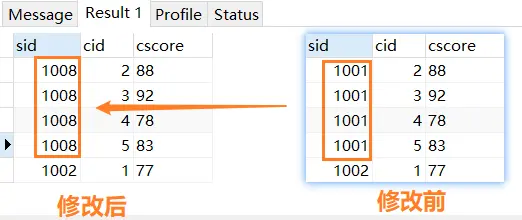 之前不能操作的内容,现在已经可以了,例如我们在学生表中将 1001学号修改为 1008 ,这样选课表中相关的内容就会自动根据修改变化了哈