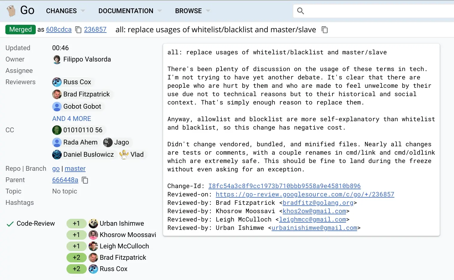 近日,Golang也有开发者提了类似的commit,要求修改whitelist/blacklist、master/slave等表述: