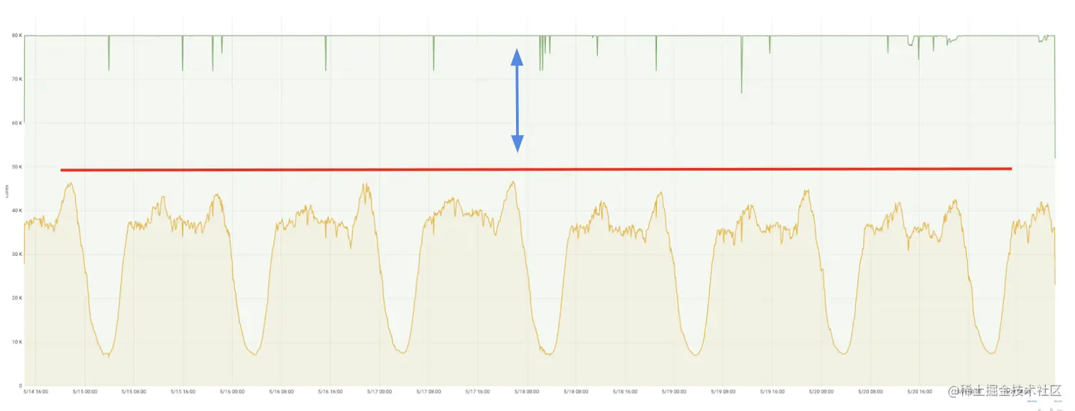 为这个目标,我们对业务的流量特性进行了分析。首先我们观察到在线业务的一个非常重要特性就是天级利用率具有很强的稳定性,在没有特殊变更的情况下,在线业务每天的流量几乎不会发生变化。 从这张图中可以看到,服务天级利用率在一周的时间维度上具有相同的波动曲线。而且通常来说,业务会倾向于申请比自己实际需要更多的资源,这样对服务本身的好处是可以在最大程度上保证流量服务的稳定性,但是造成的问题就是,始终有部分资源是业务即使在高峰期也永远用不上的,即图中红线和绿线之间的 Gap 就是一定程度上的资源浪费。