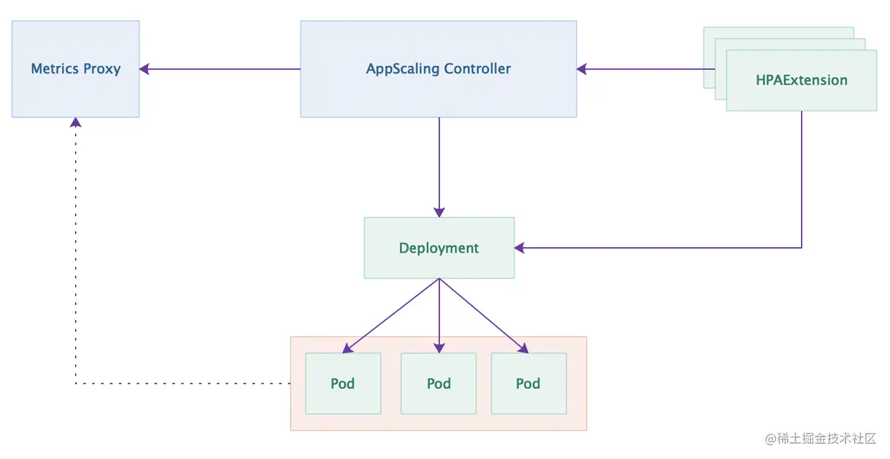 在有了底层系统为弹性伸缩的稳定性背书后,就可以真正开始介绍对应的控制流程了。弹性伸缩的控制链路可以结合这张图进行理解,这里 AppScaling Controller 会起到类似原生 HPA Controller 的作用, 它会以 30s 的粒度同步每个服务的配置,并通过 Metrics Proxy 读取 Deployment 下所有 pod 的利用率数据,据此调整实例数。TCE 中没有使用原生的 HPA,而是使用了自定义的 CRD HPAExtension,这样我们可以具体更强的控制能力,同时补充一些内部需要的特性。