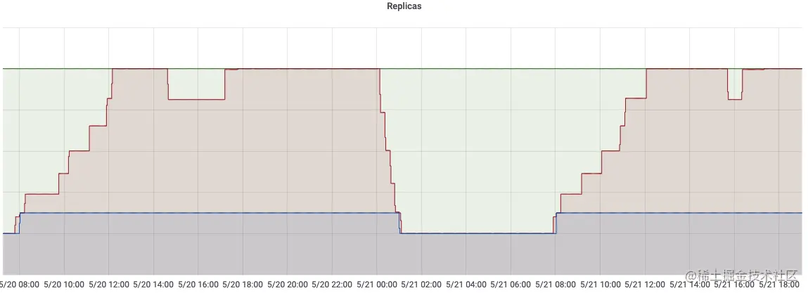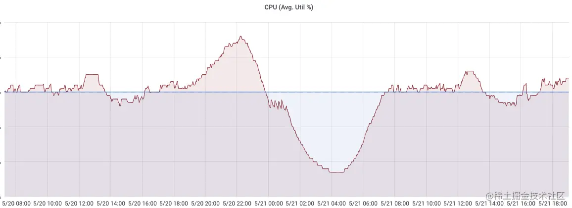 我们结合一个线上开启弹性伸缩的服务看一下对应的效果,其中上面这张图展示的是服务实例数的变化曲线,下面这张图则展示的是 CPU 平均利用率的变化曲线,图中也同样标注了用户在不同时间段的配置,例如最大扩容副本数、最小可缩容副本数、利用率阈值等。从图中可以看到,在一天的绝大部分时间段里,服务的 CPU 利用率基本维持在给定阈值的范围内小幅波动,这也是我们希望看到的最显著的效果。另外,由于该服务配置的最小可缩容副本数较高,所以在夜间低峰时,服务利用率仍然会降到低于阈值的水平,对于较为 critical 的服务,这种策略为服务提供了一定兜底的能力,在一定程度上是可以接受的,当然对于这部分资源浪费,我们仍然可以通过常态混部的手段进一步压榨和利用。最后,该服务晚高峰时的副本数已经扩到了上限,但是利用率仍然高于给定的阈值,出现这种情况一般有两种可能,一种是服务配置的资源利用率阈值不够合理,另一种就是服务的流量确实出现了增长,可扩容的上限已经不能够满足业务的需求,无论是哪种情况,TCE 都会给对应的服务 owner 发送报警,告诉他需要对弹性伸缩的配置进行一定的调整以适应流量的变化和特性。