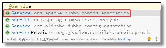 值得注意的是 @Service 注解不是 Spring 的注解而是 Dubbo 的注释: