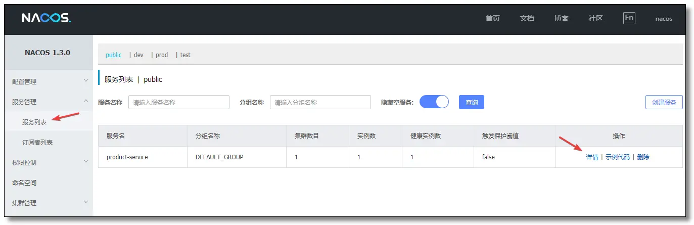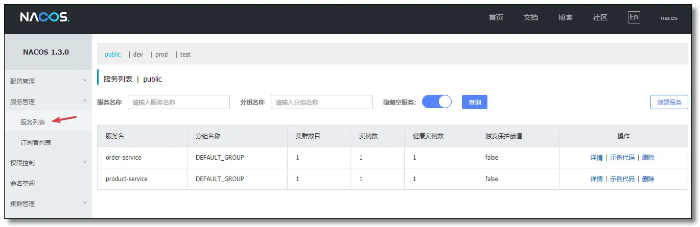 先启动 Nacos 服务器,然后启动服务提供者 product-service,访问:http://localhost:8848/nacos/ 控制台显示如下: