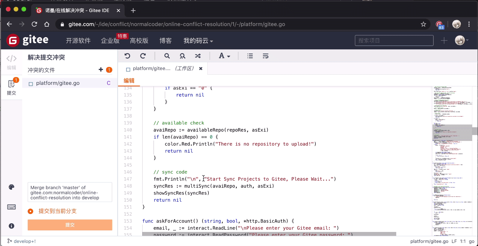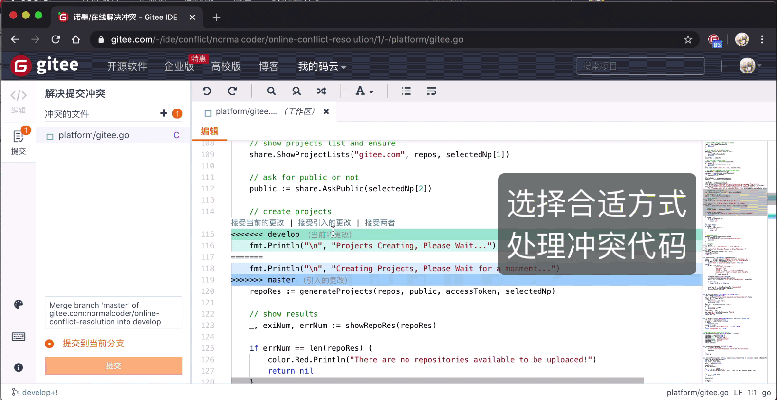 Gitee 提供 WebIDE 在线解决冲突的解决办法,无需客户端操作,在网页上即可完成冲突的解决。