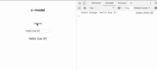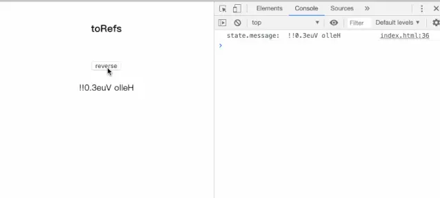 beforeCreate之后created之前执行。<head> <meta charset="UTF-8"> <meta name="viewport" content="width=device-width, initial-scale=1.0"> <meta http-equiv="X-UA-Compatible" content="ie=edge"> <title>Hello Vue3.0</title> <style> </style> <script src="../../packages/vue/dist/vue.global.js"></script> </head> <body> <h3>reactive</h3> <div id='app'></div> </body> <script> const { createApp, reactive } = Vue const App = { template: ` <button @click='click'>reverse</button> <div style="margin-top: 20px">{{ state.message }}</div> `, setup() { console.log('setup '); const state = reactive({ message: 'Hello Vue3!!' }) click = () => { state.message = state.message.split('').reverse().join('') } return { state, click } } } createApp(App).mount('#app') </script> </html>