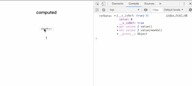 <html lang="en"> <head> <meta charset="UTF-8"> <meta name="viewport" content="width=device-width, initial-scale=1.0"> <meta http-equiv="X-UA-Compatible" content="ie=edge"> <title>Hello Vue3.0</title> <style> </style> <script src="../../packages/vue/dist/vue.global.js"></script> </head> <body> <h3>ref & isRef</h3> <div id='app'></div> </body> <script> const { createApp, reactive, ref, isRef } = Vue const App = { template: ` <button @click='click'>count++</button> <div style="margin-top: 20px">{{ count }}</div> `, setup() { const count = ref(0); console.log("count.value:", count.value) // 0 count.value++ console.log("count.value:", count.value) // 1 // 判断某值是否是响应式类型 console.log('count is ref:', isRef(count)) click = () => { count.value++; console.log("click count.value:", count.value) } return { count, click, } } } createApp(App).mount('#app') </script> </html>