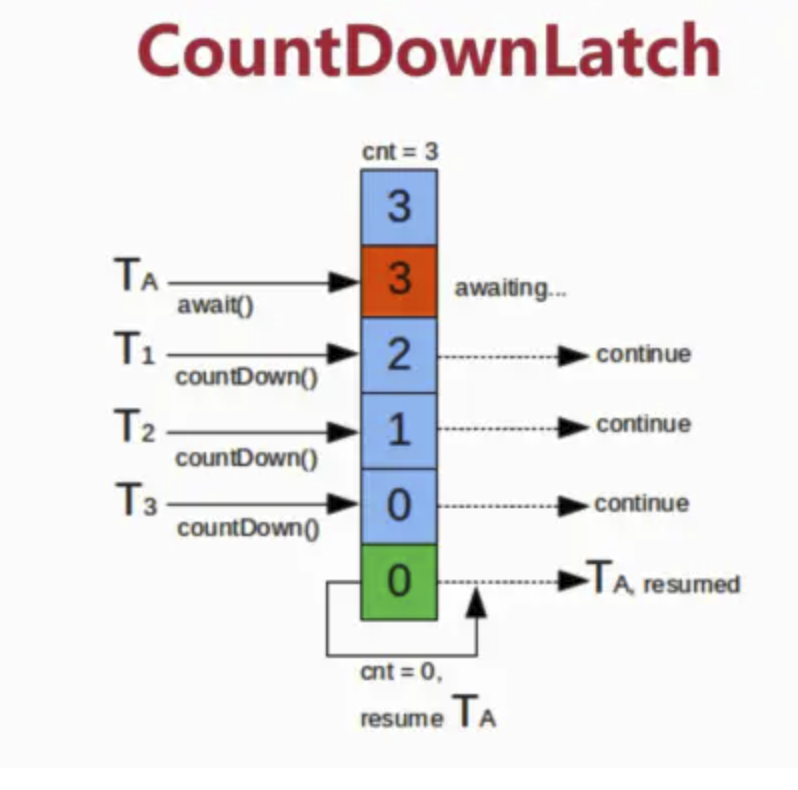 - TA线程 实例化 CountDownLatch对象并初始count为3