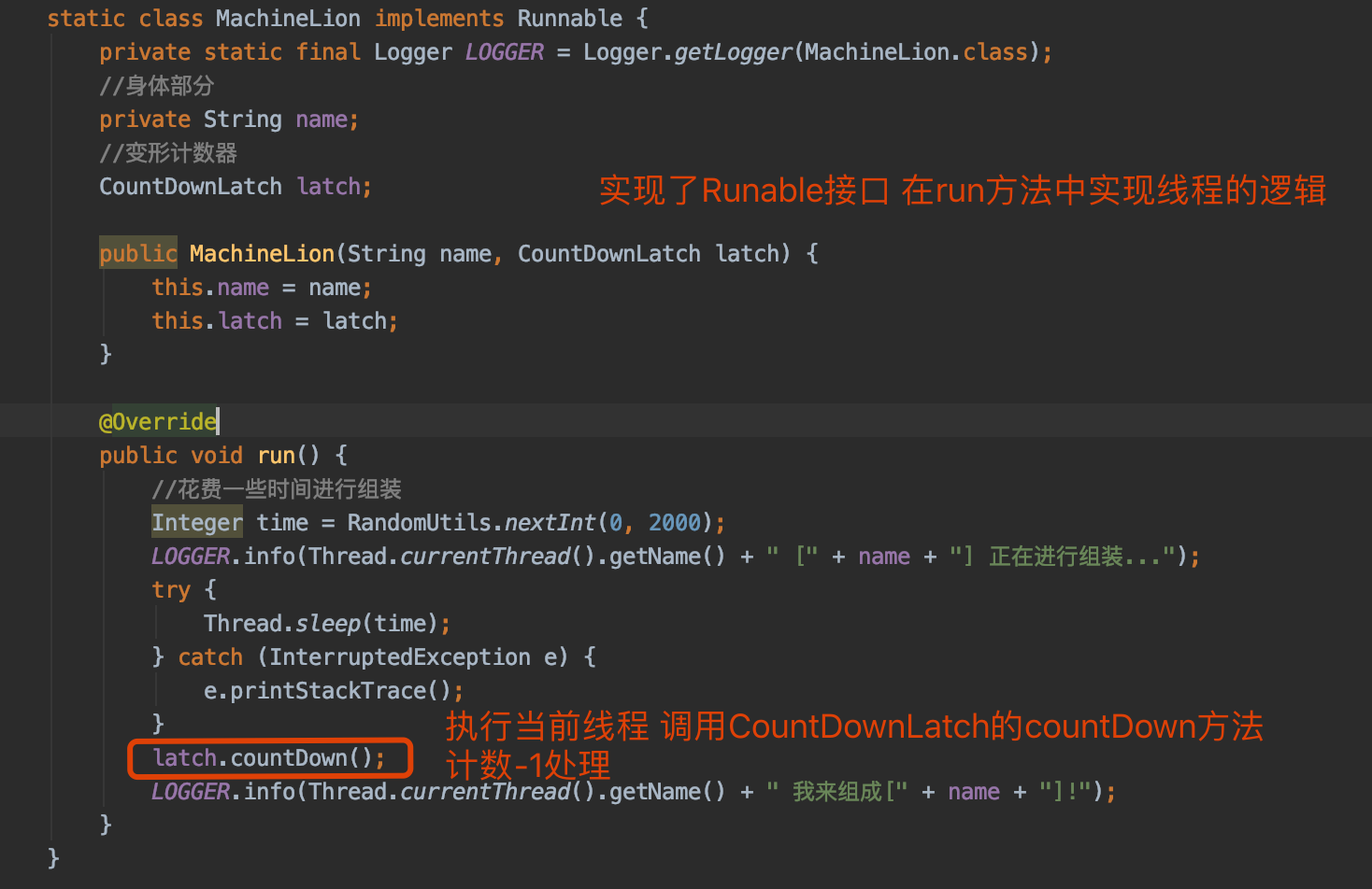 调用该类await方法的线程会一直处于阻塞状态,直到其他线程调用countDown方法使当前计数器的值变为零,每次调用countDown计数器的值减1。