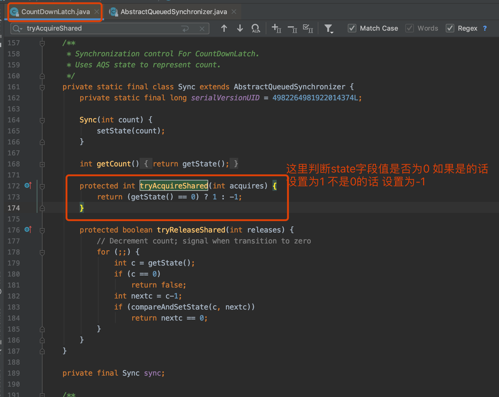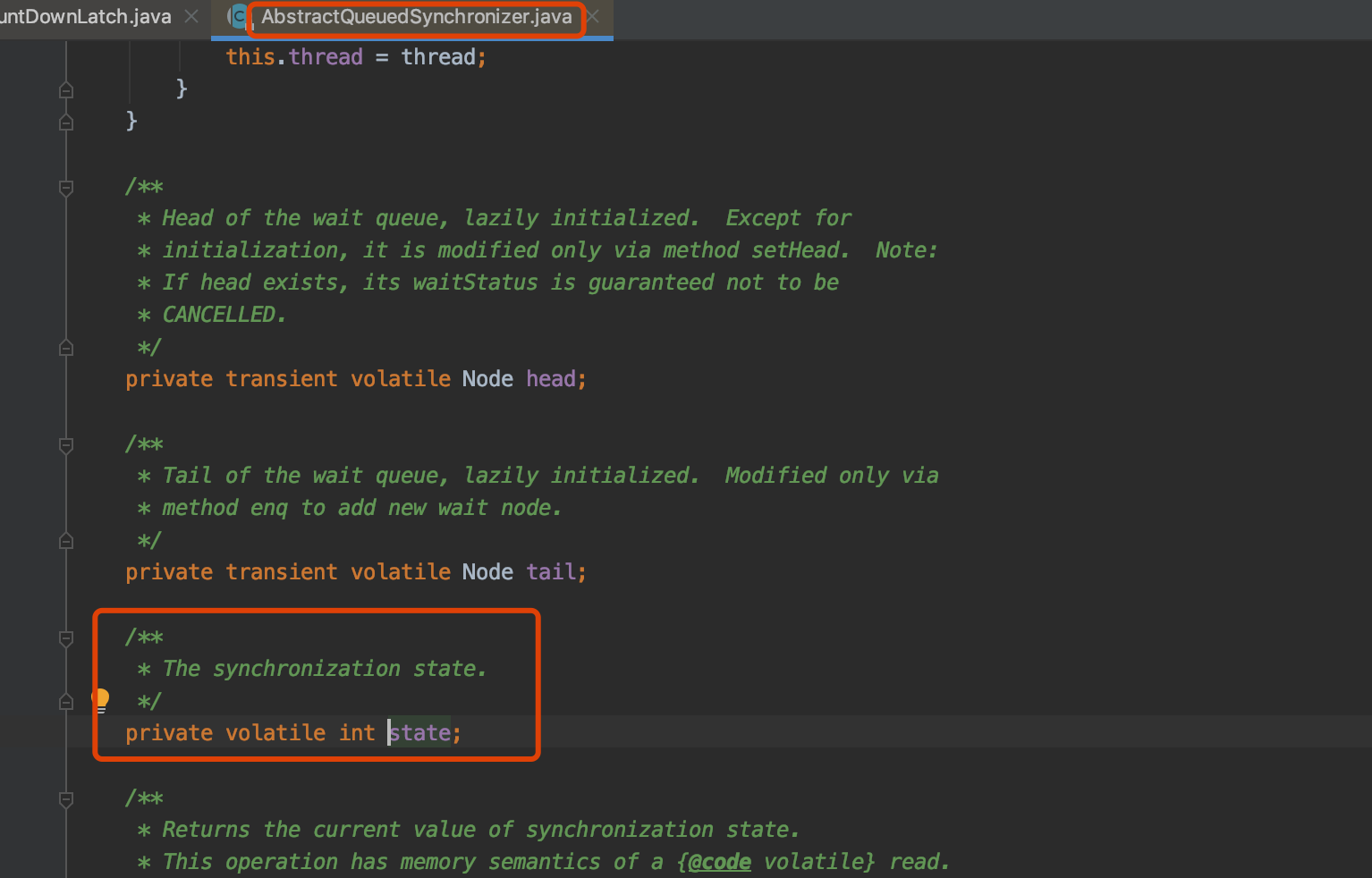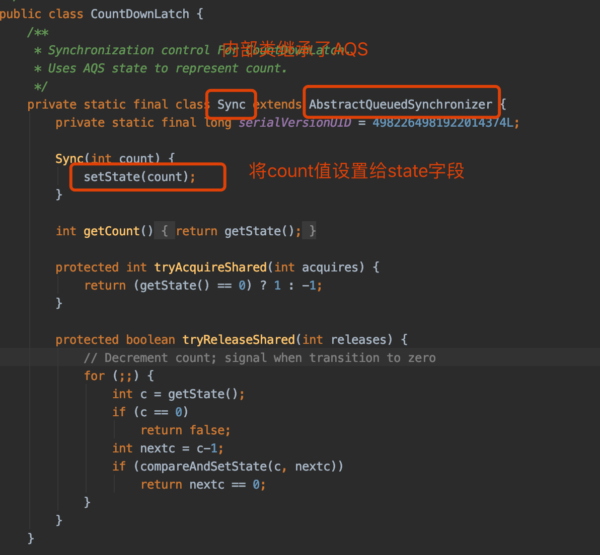 在初始化CountDownLatch的时候会实例化这个继承了AQS的内部类Sync并且将count传给AQS的state变量