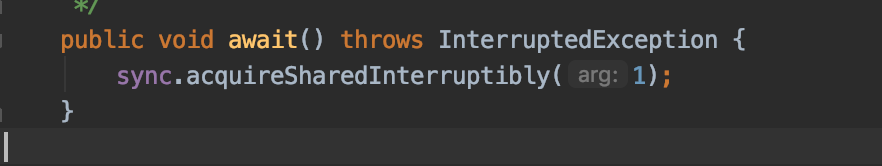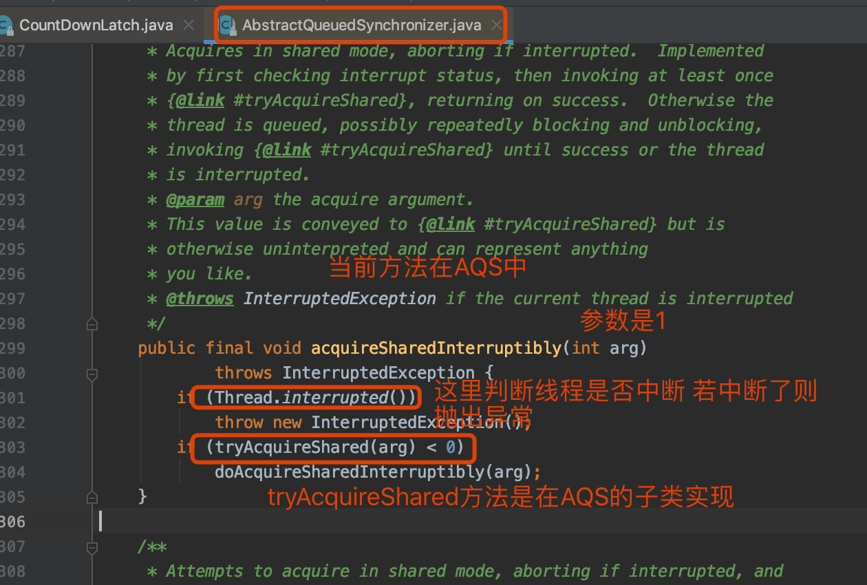 countDownLatch的await方法 调用了 AQS的acquireSharedInterruptibly方法并且传入了参数1 接下来对该方法分析