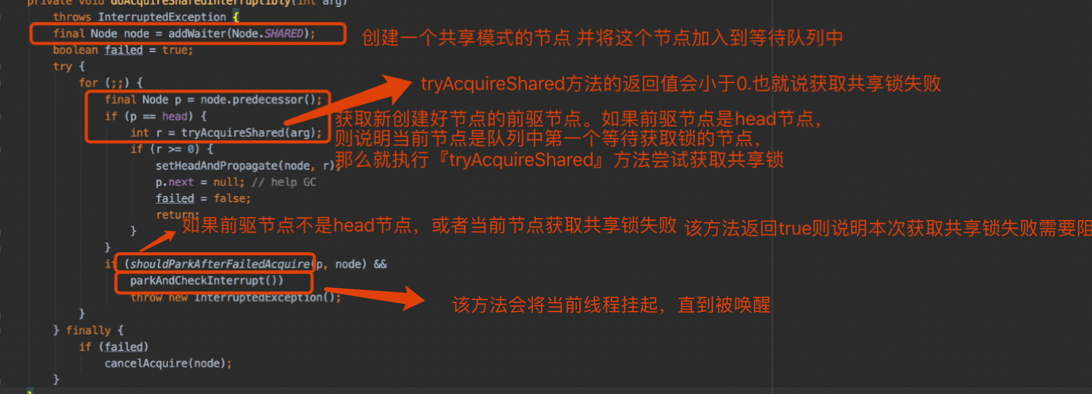 这个逻辑过程中使用了大量的CAS来进行原子性的修改,当修改失败的时候,是会通过for(;;)来重新循环的,也就是说『doAcquireSharedInterruptibly』使用自旋锁(自旋+CAS)来保证在多线程并发的情况下,队列节点状态也是正确的以及在等待队列的正确性,最终使得当前节点要么获取共享锁成功,要么被挂起等待唤醒