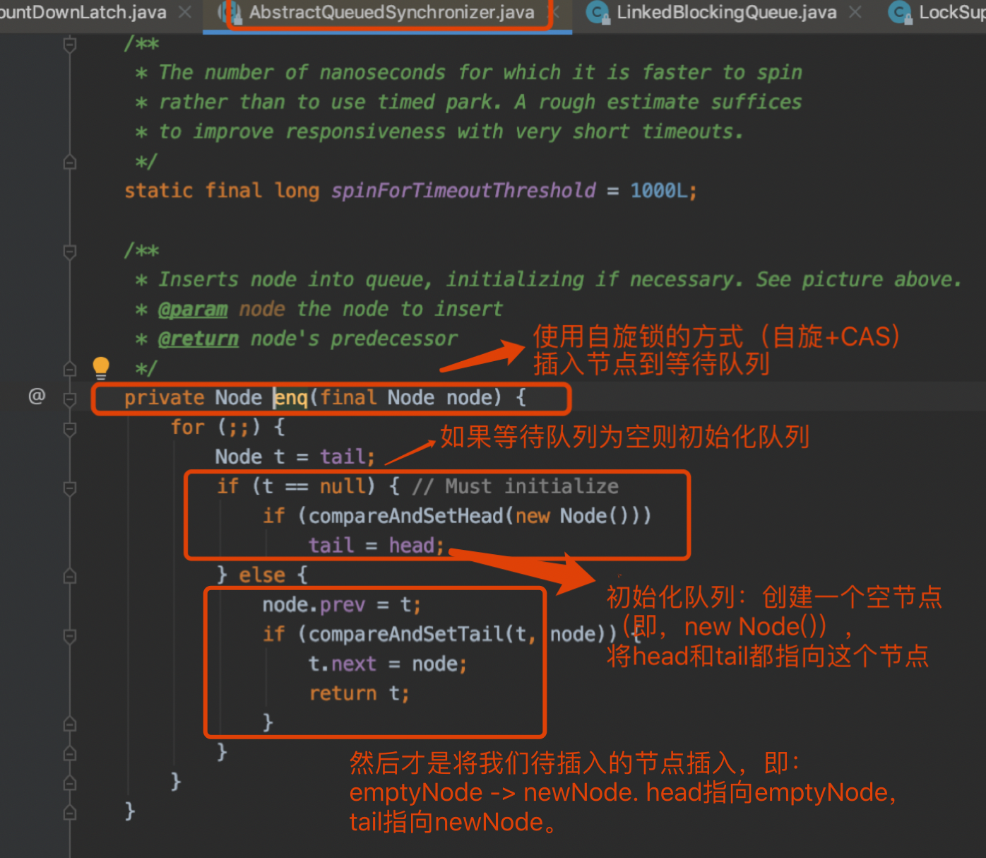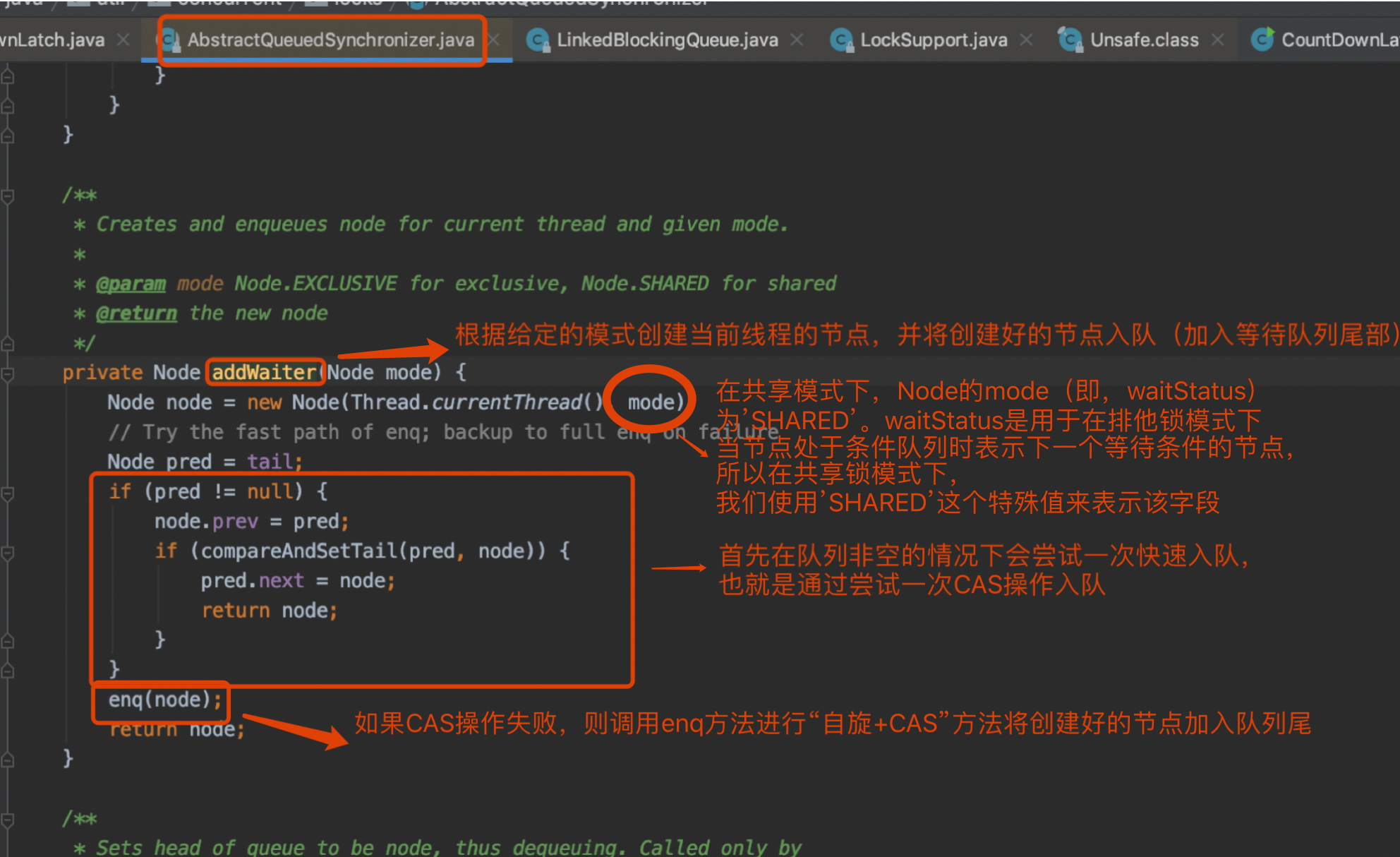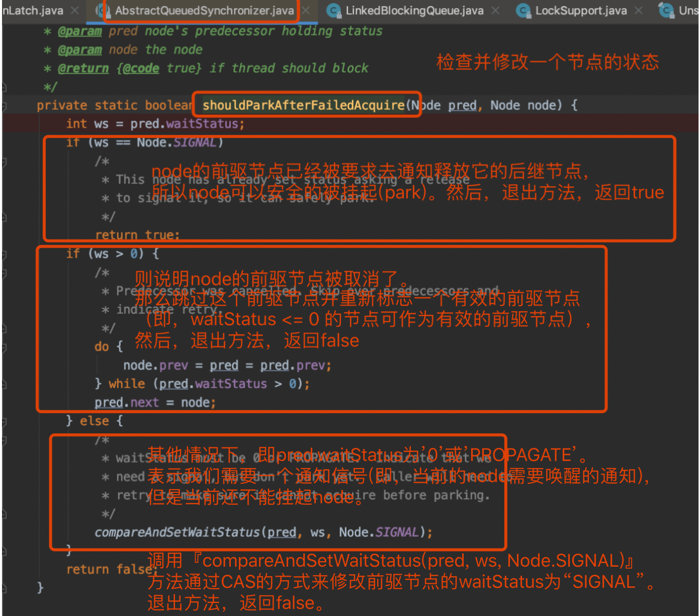 还值得注意的时,因此该方法的CAS操作都是没有自旋的,所以当它操作完CAS后都会返回false,在外层的方法中会使用自旋,当发现返回的是false时,会再次调用该方法,以检查保证有当前node有一个有效的prev,并且其waitStatus为’SIGNAL’,在此情况下当前的线程才会被挂起(park)。
