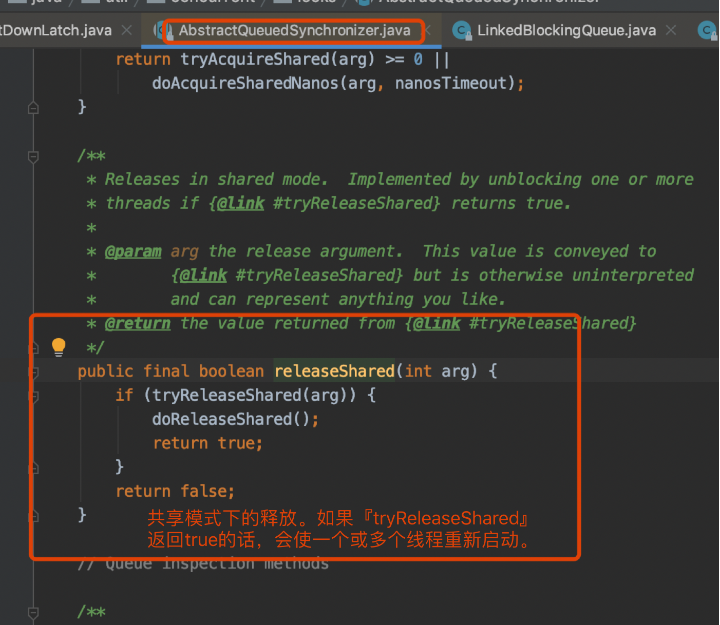 『tryAcquireShared』 在共享模式下尝试获取。这个方法需要查询是否对象的状态允许在共享模式下被获取,如果允许则去获取它。 这个方法总是被线程执行获取共享锁时被调用。如果这个方法报告失败,那么获取方法可能会使线程排队等待,如果它(即,线程)还没入队的话,直到其他的线程发出释放的信号。 默认实现抛出一个“UnsupportedOperationException” 返回: a)< 0 : 一个负数的返回表示失败; b) 0 : 0表示在共享模式下获取锁成功,但是后续的获取共享锁将不会成功 c)> 0 : 大于0表示共享模式下获取锁成功,并且后续的获取共享锁可能也会成功,在这种情况下后续等待的线程必须检查是否有效。