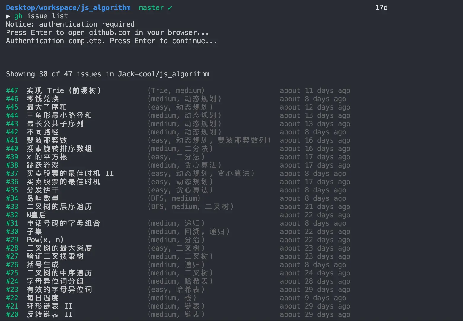 当我们将本地代码提交到 GitHub 后,就可以在 GitHub 网站上查看到各种的交互信息了,例如其它开发者提的 Issue,或者提交的代码合并请求等。但是,如果我们能在命令行上直接查看、处理这些信息,那么这一定非常酷。