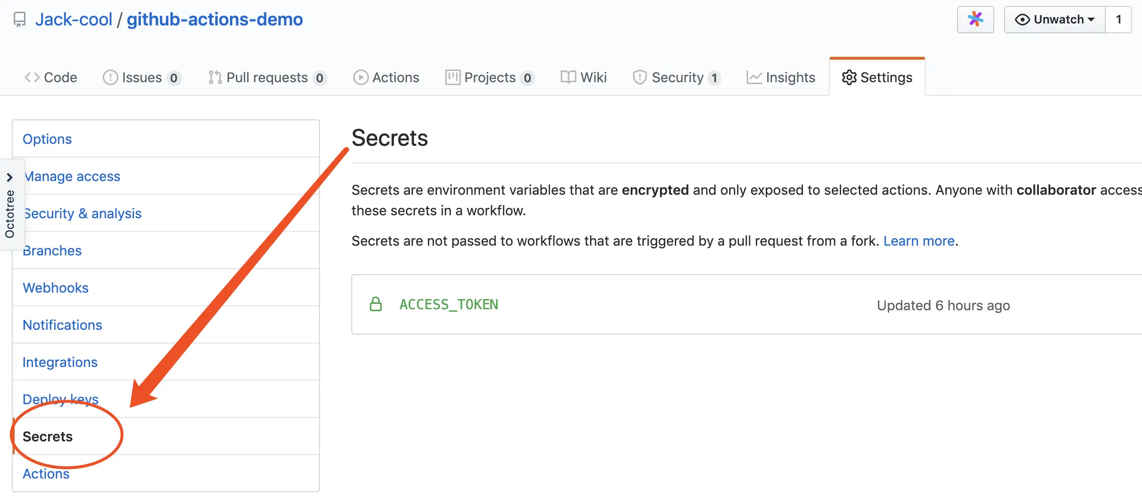 由于示例需要将构建成果发到GitHub仓库,因此需要 GitHub 密钥。按照官方文档,生成一个密钥。然后,将这个密钥储存到当前仓库的Settings/Secrets里面。