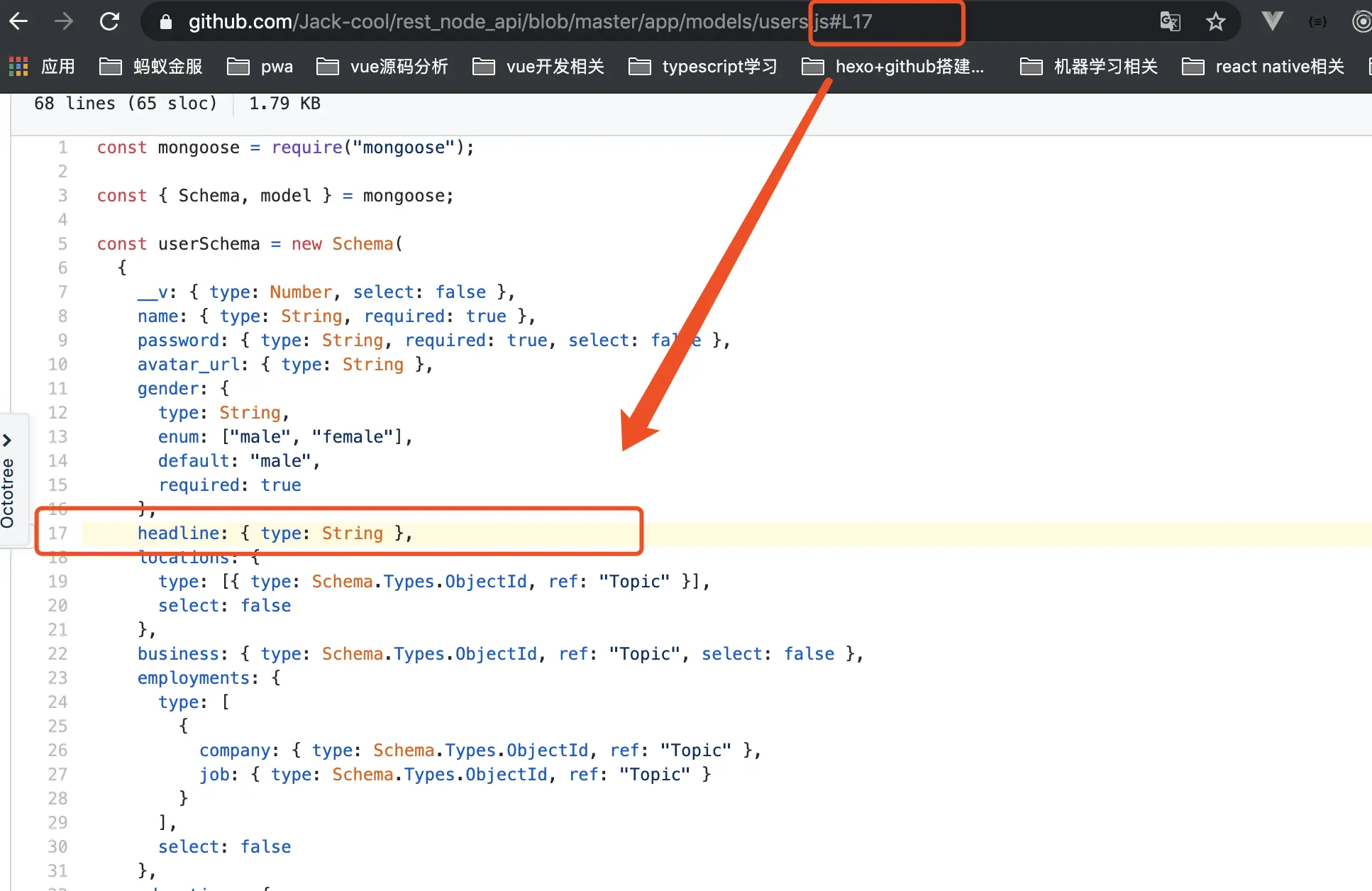 如果是想分享某几行的,可以在url后面添加如#L 开始行号-L 结束行号,像https://github.com/Jack-cool/rest_node_api/blob/master/app/models/users.js#L17-L31,效果如下图:
