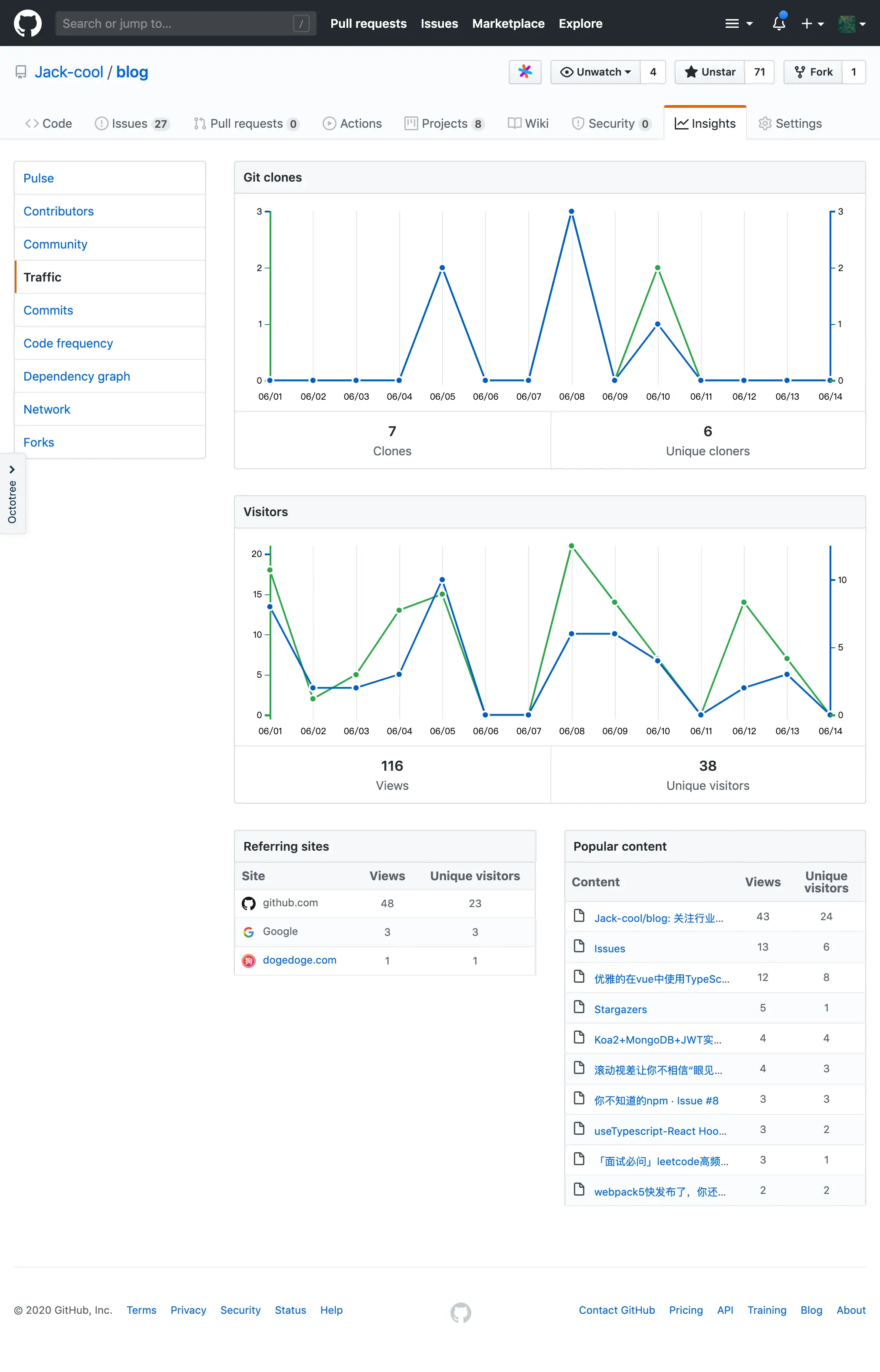 其中 Referring sites 表示大家都是从什么网站来到你的项目的,Popular content 则表示大家经常看你项目的哪些文件。