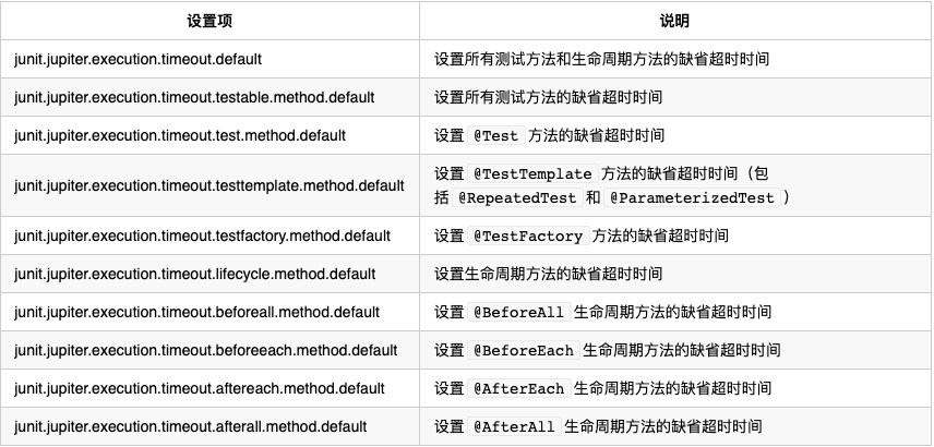 更具体的配置参数会覆盖更不具体的配置参数。例如:junit.jupiter.execution.timeout.test.method.default > junit.jupiter.execution.timeout.testable.method.default > junit.jupiter.execution.timeout.default