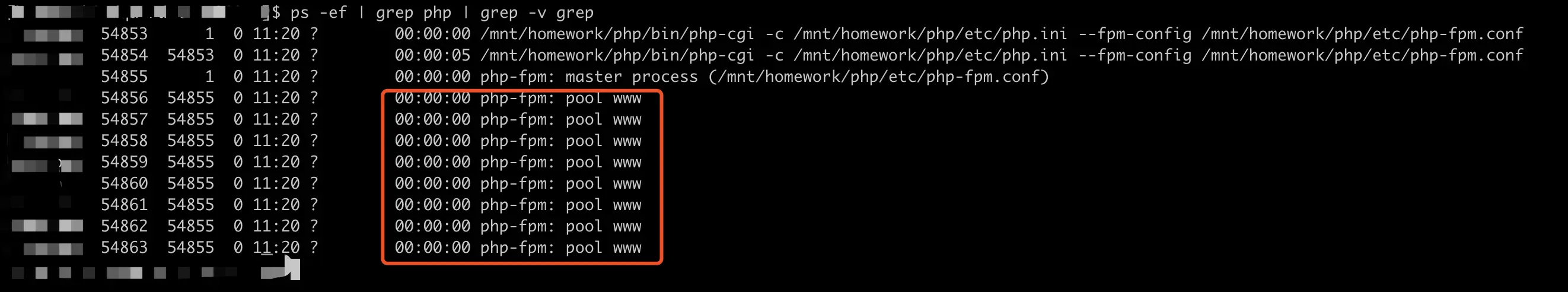 看上面截图中红色部分一共有 8 个 FPM 的子进程,这个涉及到了 PHP-FPM 的进程管理模式
