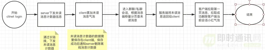 2)客户端每次登录时,服务端不推送全量离线消息,只推送离线消息计数器(这部分数据存储在redis里,并且数据量很小),这个数量用户显示在客户端消息列表的未读消息小红点上。