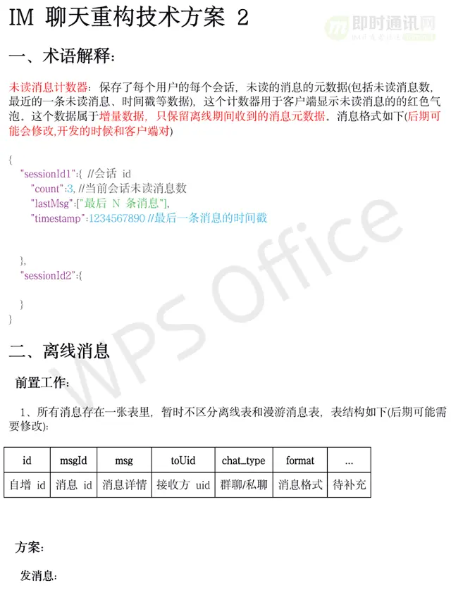 1)我们增加了离线消息计数器的概念:保存了每个用户的每个会话,未读的消息的元数据(包括未读消息数,最近的一条未读消息、时间戳等数据),这个计数器用于客户端显示未读消息的的红色气泡。这个数据属于增量数据,只保留离线期间收到的消息元数据。