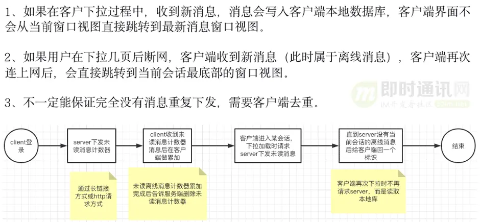 - 1)虽然这种方案,客户端不会卡死,但是如果当前用户的离线消息特别多,那么收到所有离线消息的时间会非常长;